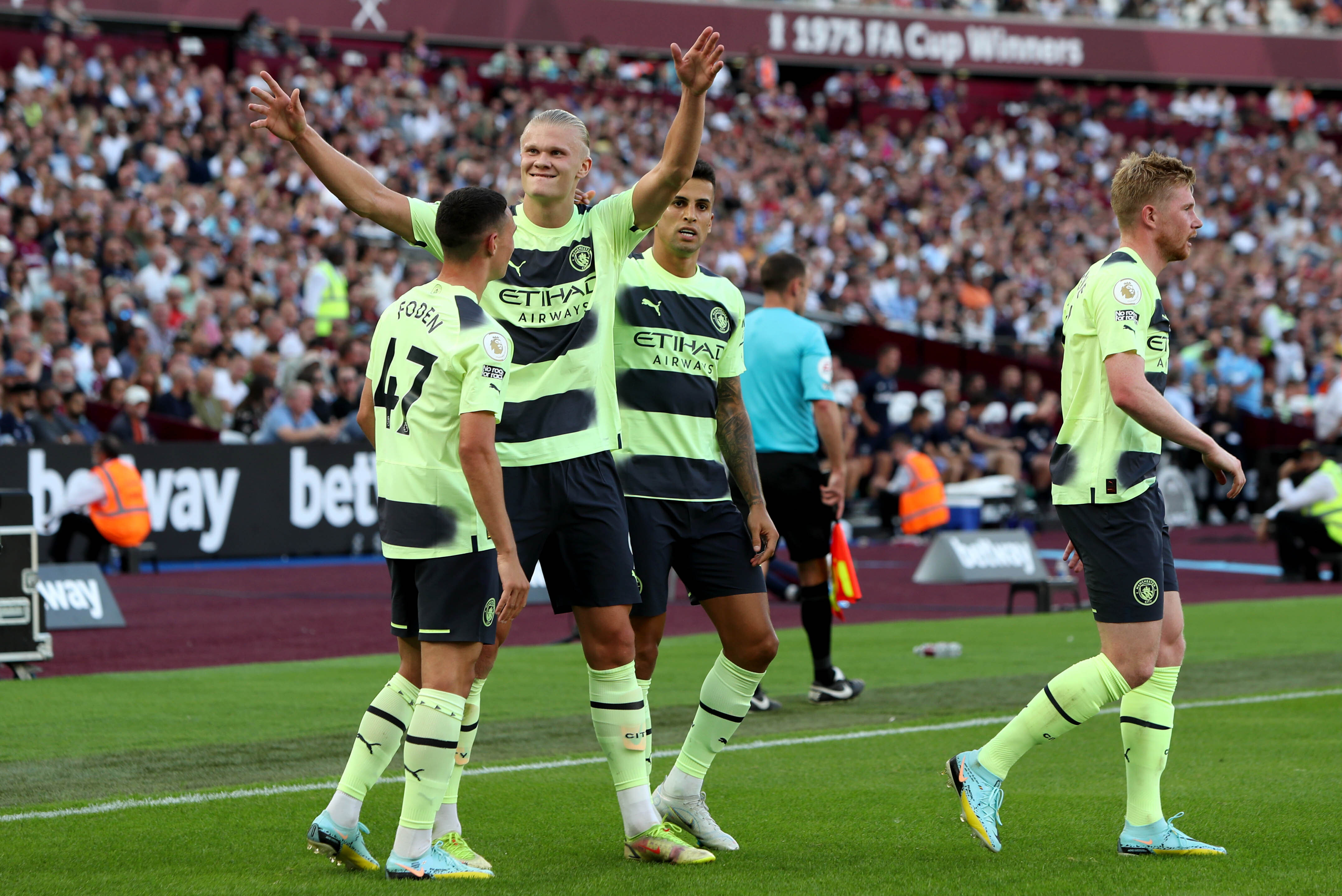 (L to R) Phil Foden, Erling Haaland and Joao Cancelo against West Ham
